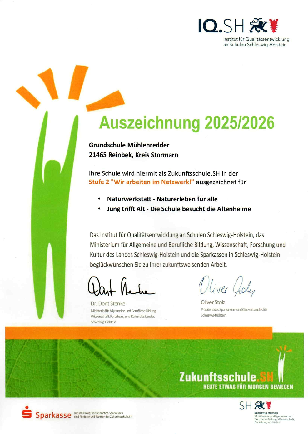 Die Grundschule Mühlenredder wird schon seit Jahren als „Zukunftsschule“ der Stufe 2 ausgezeichnet. Auch in den kommenden Schuljahren 2025/2026 und 2026/2027 haben wir es wieder geschafft die Auszeichnung zu erhalten. Wir haben zwei Kooperationspartner (das C-Haus /Courvoisierhaus und die Altenheime) mit welchen wir an Themen zur nachhaltigen Entwicklung arbeiten.
